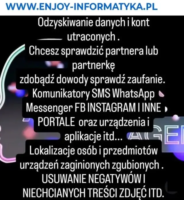 Oferujemy kompleksowe wsparcie w zakresie odzyskiwania dostępu do kont (WhatsApp, Instagram, Gmail, Yahoo, Facebook, Snapchat), odzyskiwania dostępu do urządzeń i sieci (Android, Wi-Fi), odzyskiwania portfeli kryptowalut (Bitcoin, Ethereum) oraz innych zasobów cyfrowych; namierzania i lokalizacji utraconych lub skradzionych przedmiotów; analiz i wzmacniania bezpieczeństwa systemów IT; ochrony przed stalkingiem i trollingiem internetowym; doradztwa w zakresie bezpieczeństwa kryptowalut i systemów bankowych oraz testowania oprogramowania i przeprowadzania audytów bezpieczeństwa. Działamy wyłącznie w granicach prawa, koncentrując się na ochronie i odzyskaniu Twoich danych oraz bezpieczeństwie cyfrowym.